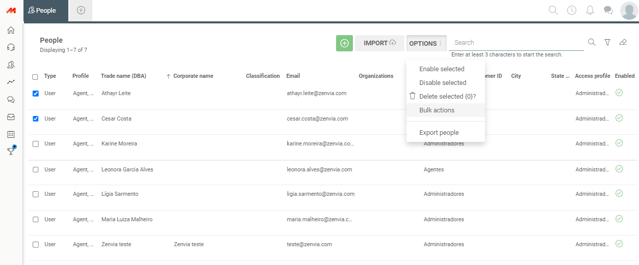 This feature is available to all users with permission to edit the people registration. Initially, it will be hidden (as well as the delete/disable selected options). To use it, simply access the people grid and select one (or more) record(s). Once done, just click on the "options" menu, where then, among the alternatives, Bulk Actions will be displayed.