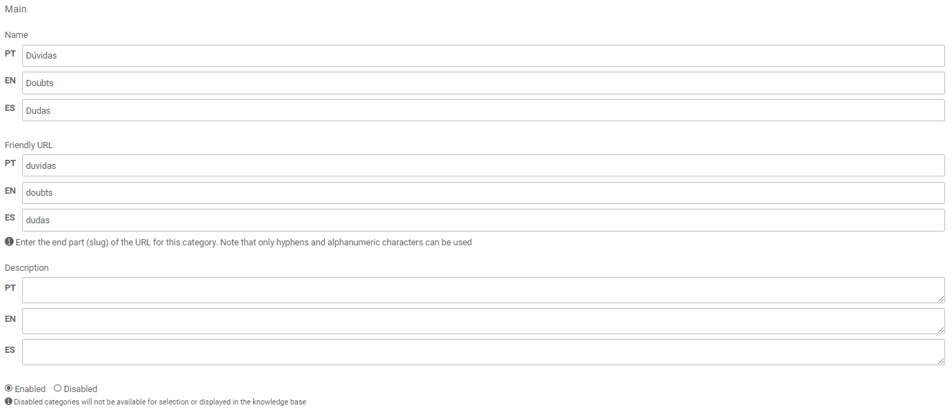 To ensure that articles are available in the knowledge base, it is necessary that in addition to publishing the article, it is linked to a category. When using the multilingual knowledge base, it is necessary to add translations for the categories so that articles are published correctly. Go to: Settings > Knowledge Base > Categories.
