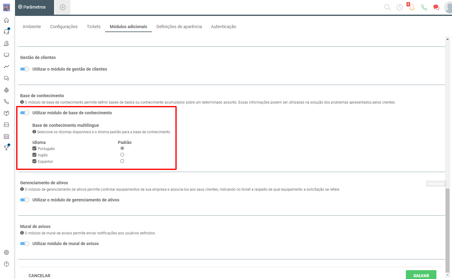 Accessing the parameters of your Movidesk, in the "additional modules" tab, you will have the option to specify which languages will be part of your knowledge base, and also, define which will be the default language.