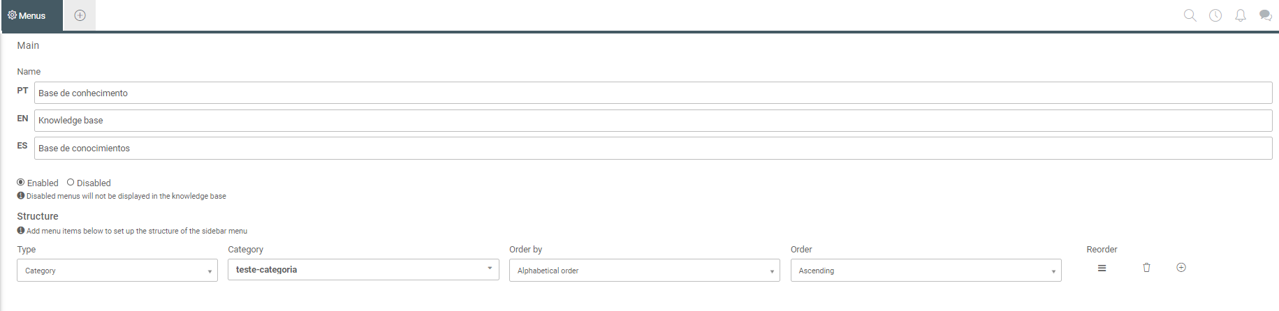 After enabling the languages, it is necessary to add translations for the menus of the selected languages to ensure proper matching with the articles. To do this, go to: Settings > Knowledge Base > Menus.