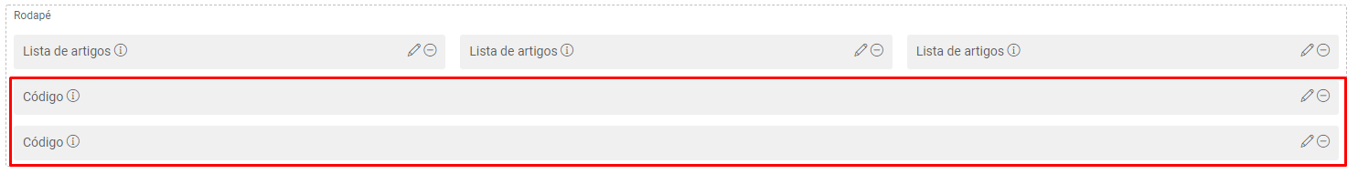 Los códigos "Rodape1" y "Rodape2" se utilizan en el pie de página. Esta captura de pantalla sirve como ejemplo de nuestra base, que tiene 3 listas de artículos antes de los códigos: