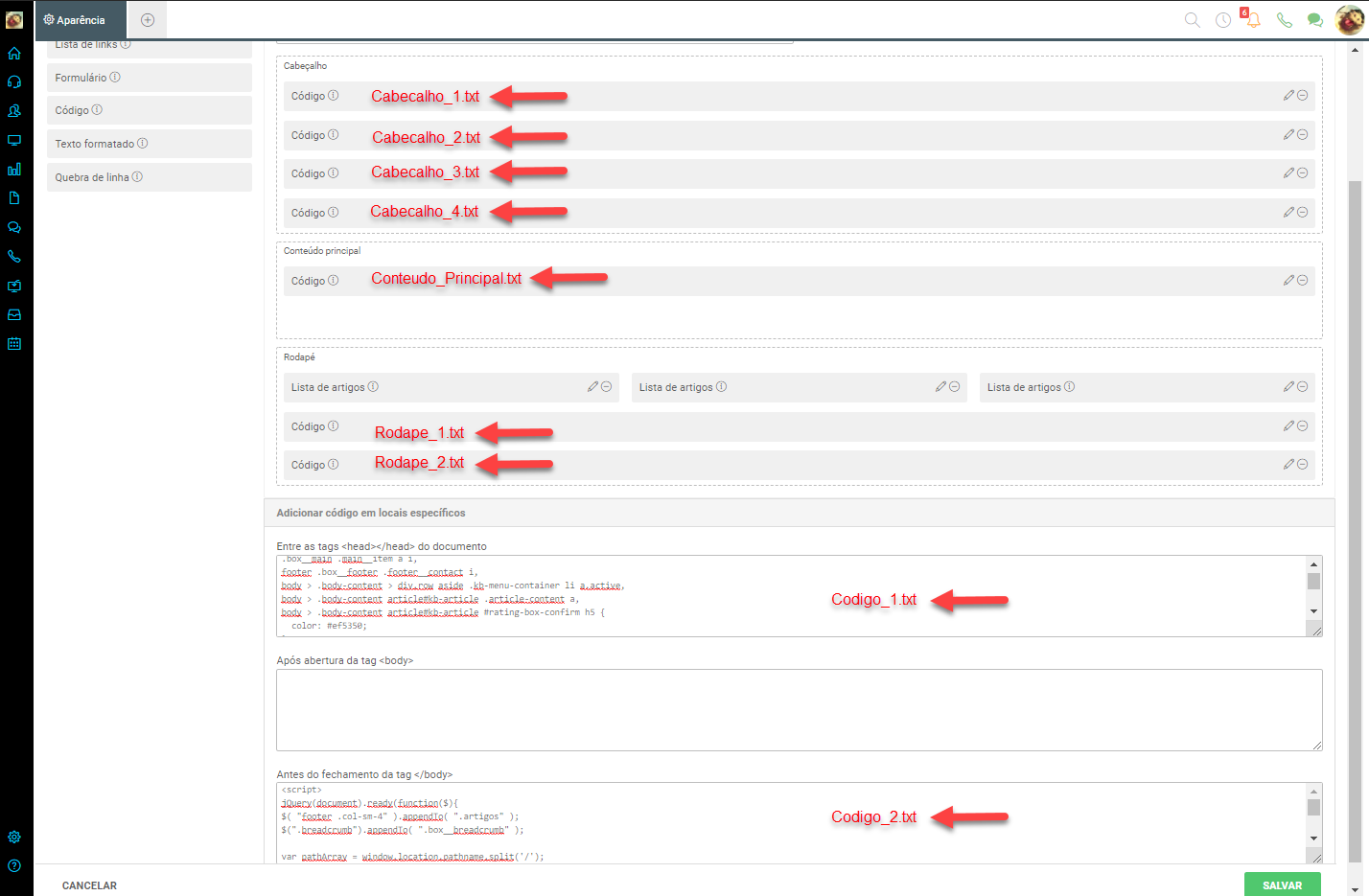 Preste mucha atención al nombre de cada documento para pasar el código al lugar correcto en Movidesk, como se mostrará en el siguiente tema.